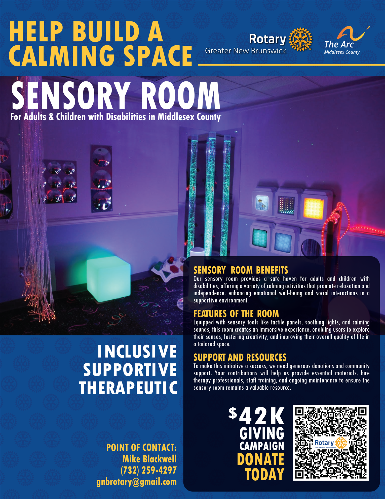 The Rotary Club of Greater New Brunswick is seeking donors to help build a Sensory Room for adults and children with disabilities. We need your help to make this dream come true for so many adults and children here in New Jersey. Rotary International, Rotary Districts and Rotary Clubs from around the world are helping with this campaign. We need local donations to make this project successful. Please help donate to this project: https://www.crsadmin.com/eventportal/Registrations/PublicFill/EventPublicFill.aspx?evtid=cd539a7f-35d6-4adc-9c9d-da5b49c83e9d